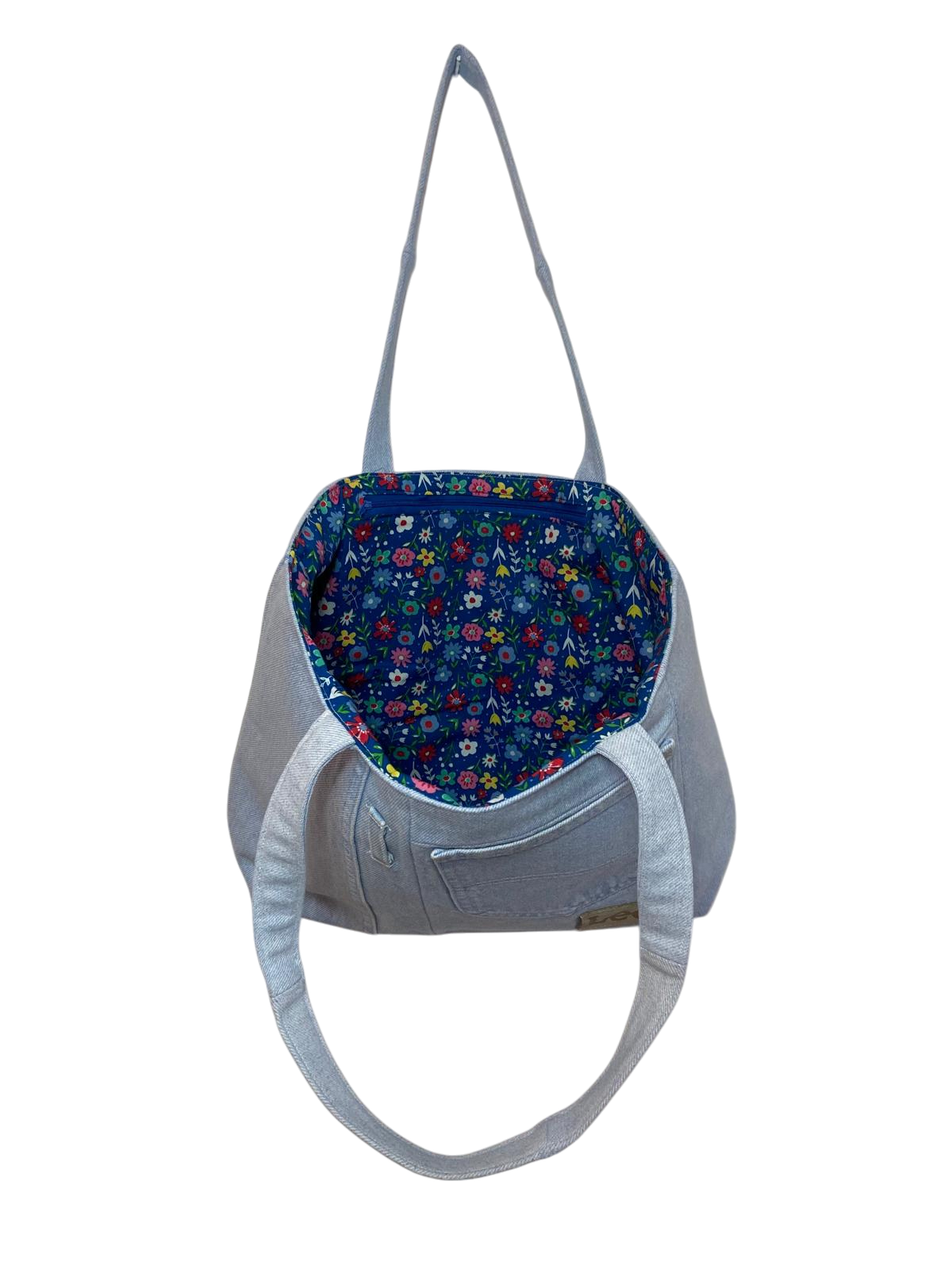 Perfectly sized for everyday adventures, this roomy denim tote includes a secure internal zip pocket and a matching removable zip-up pouch for easy organisation. The interior is fully lined in a vibrant floral cotton fabric, adding a joyful pop of colour against the timeless denim exterior.